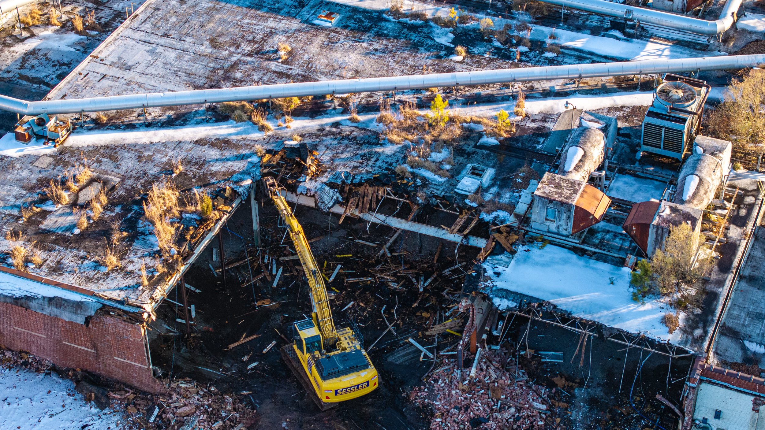 Sessler Wrecking was responsible for the demolition and abatement of a 221,000-square-foot former textile plant on a 7-acre Superfund site. Our crew also removed the adjacent boiler house, which housed three boilers that supplied steam through an underground tunnel, along with multiple support structures, a pump house, water cisterns, and a 250,000-gallon concrete water tank for fire suppression.